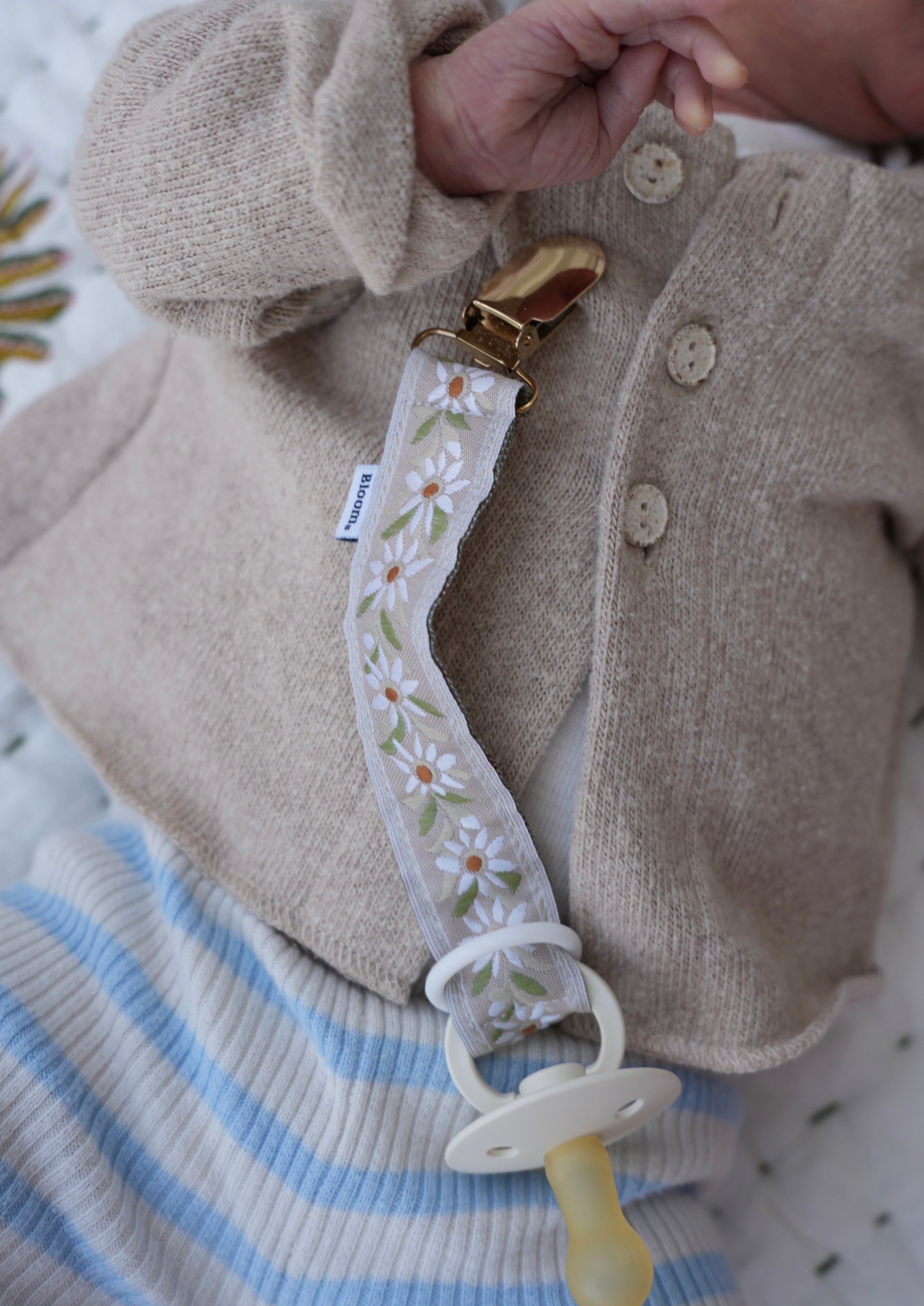 Dit handgemaakte speenkoord van geweven katoen is beschikbaar in verschillende prints, perfect om te matchen met de outfit van je kleintje. Een praktisch, schattig en veilig accessoire voor dagelijks gebruik.
